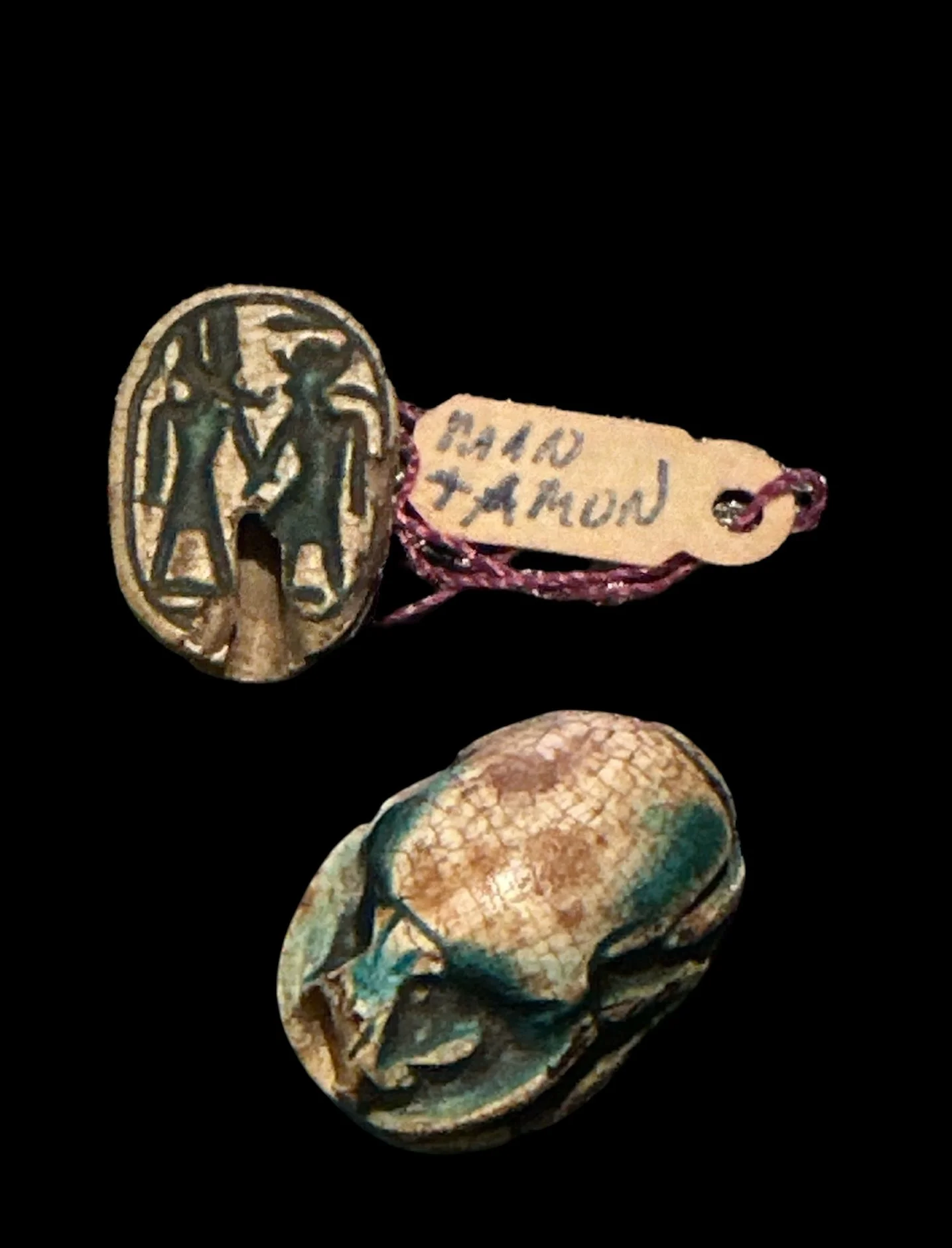 The Beetle Back: The convex side is carved naturalistically to represent the Scarabaeus sacer. The remnant of blue-green glaze connects the object to Khepri, the god of the rising sun and eternal renewal.